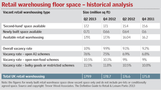 The result of so many big-name retailers collapsing in quick succession was a sharp upswing in retail park vacancy rates in 2012, but this is declining fast. Since the middle of this year, with take-up of retail warehousing space continuing apace, and as a result of few additional new developments opening, Trevor Wood Associates predicts the overall rate will fall back to below 10% at the end of 2013.