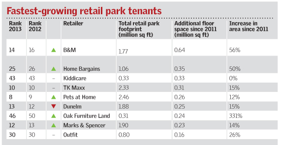 Among the biggest winners is B&M, which has been most prolific in taking up space in 2013. According to figures released by property research firm Trevor Wood Associates, the retail chain is the fastest growing retail park tenant, taking 640,000 sq ft in 2012 and 2013, a 56% increase in area since 2011. The discount retailer emerged as the leading acquisitor of former Focus DIY stores. Of the 244 units available after the DIY retailer went into administration in May 2011, B&M has taken 29 as of September 2013. B&Q has acquired 21 units, while Wickes has taken on 18 units, according to research by Trevor Wood Associates.