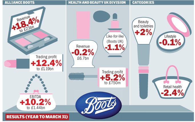 Boots’ core UK health and beauty business, including opticians, delivered trading profit up 5.2% to £750m last year, when revenue slipped 0.2% to £6.7bn. Like-for-likes at the core chain fell 1.1%.