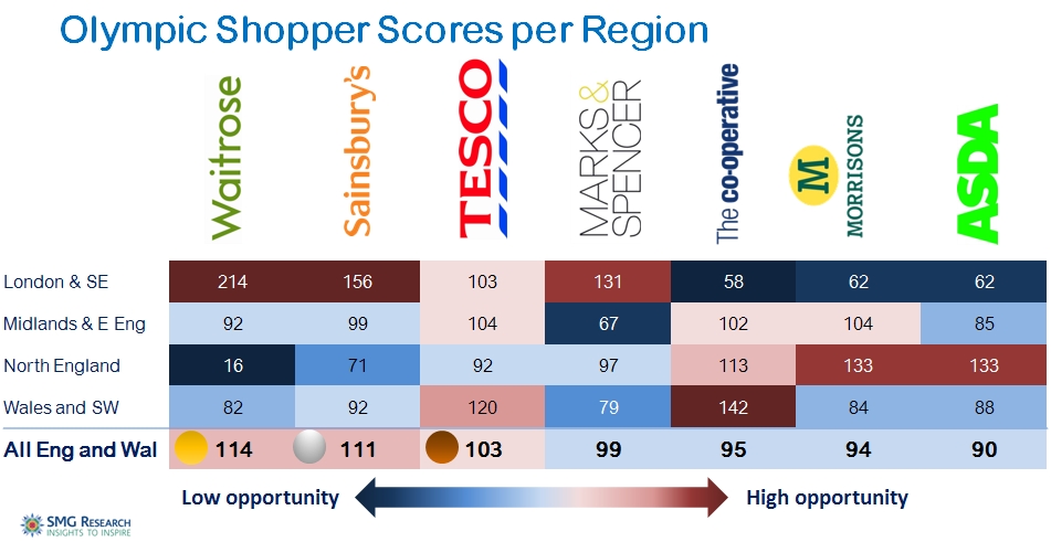 The challenge for ASDA and Morrisons is to rouse excitement about London 2012, as their customers are least likely to celebrate the Olympics this year. As things stand, any success they are likely to have is restricted to the north. However, other research carried out in our SupermarketUK study shows that sharing experiences with friends and family is especially important to ASDA and Morrisons’ shoppers. If both these supermarkets work hard at focusing marketing messages upon people coming together to enjoy the Games, they could drastically improve their performance and even move into the medals table.
