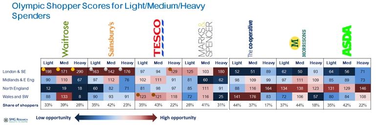 - In the North and Midlands, opportunities exist for Co-Op, ASDA and Morrisons to poach from each other. Each needs to make sure it protects its shoppers, especially ASDA and Morrisons.
