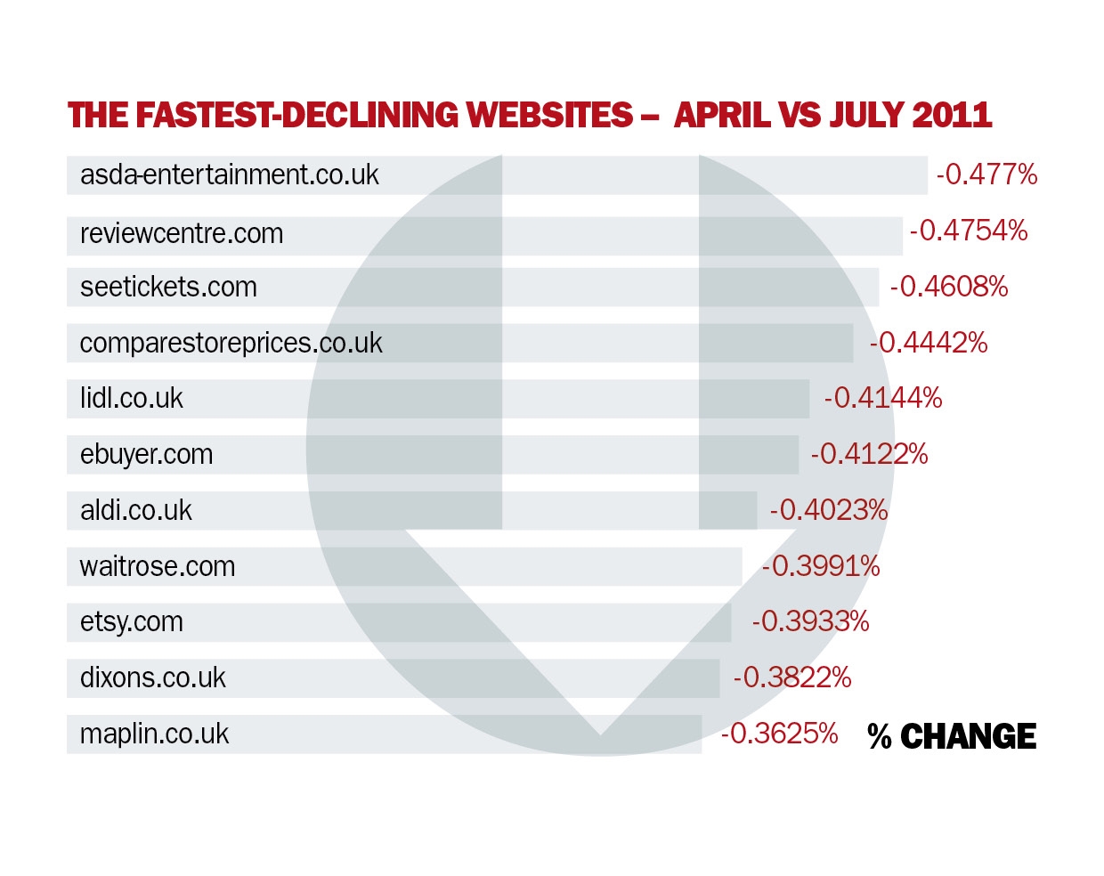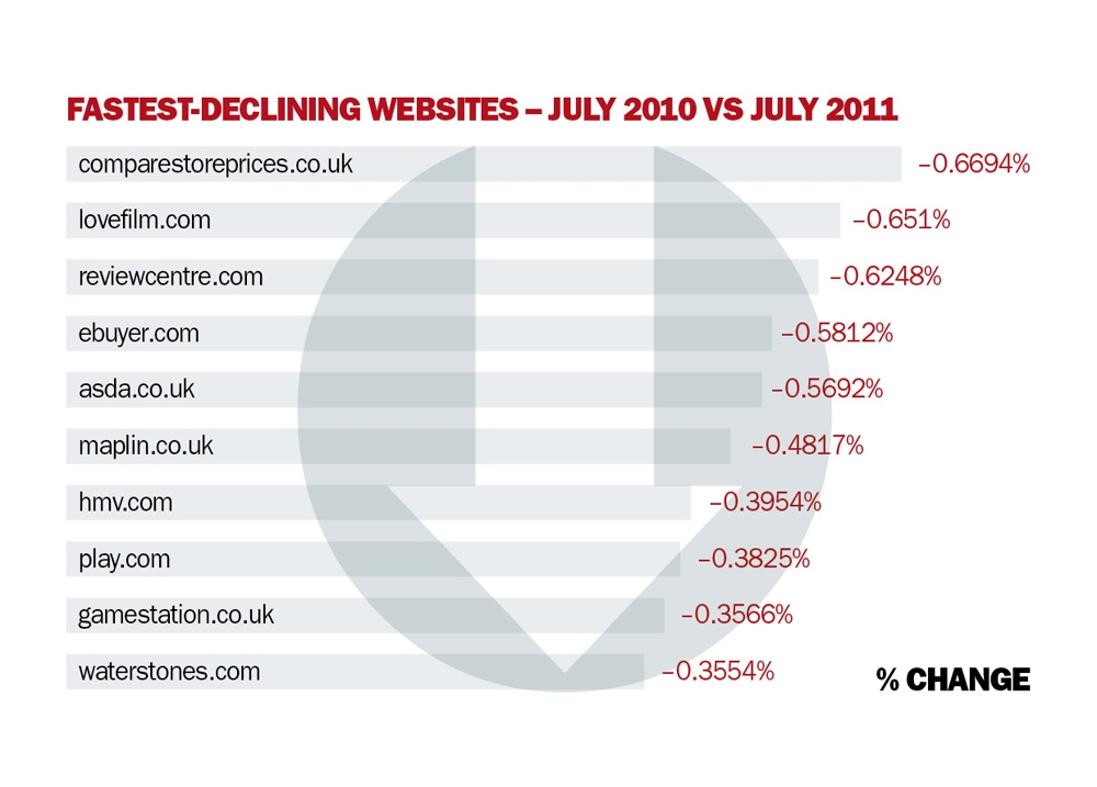 Media and entertainment websites also appear to be experiencing a collective slide in the number of people visiting their sites. Half of those in the fastest declining retail sites for July 2010 versus July 2011 fall into this category; Lovefilm, HMV, Play.com, Gamestation and Waterstone’s. Meanwhile Asda-entertainment.co.uk tops the list of the fastest-declining sites for April vs July 2011. Newman believes that the prevalence of electrical and entertainment websites is partly caused both by increased competition and less consumer demand, adding that a broadening of product offer at major online players such Amazon further drains market share and traffic from other sites.