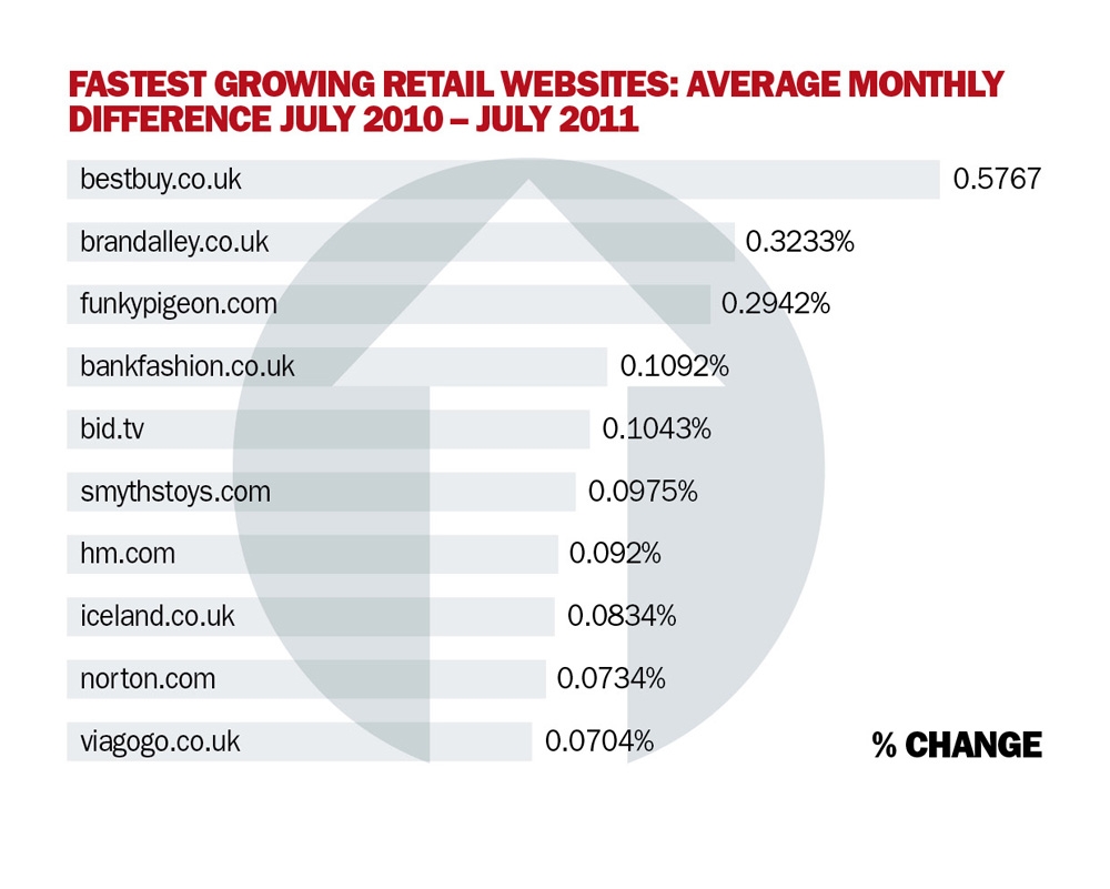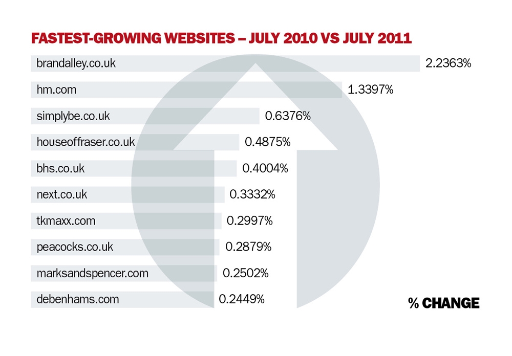 BrandAlley tops the list of fastest-growing retailers for July 2011 versus July 2010, and is second in the list for the average monthly difference over the 12 months to July 2011.