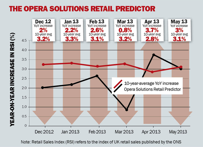 The low rate of growth is likely to continue into early 2013, the Opera Solutions Retail predictor for Retail Week showed.