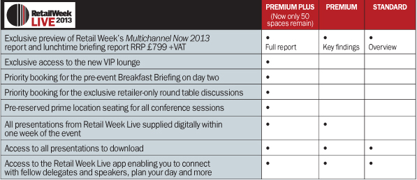 The limited Premium Plus package offers an exclusive digital version of Retail Week’s Multichannel Now 2013 report (£799 RRP) and a lunchtime briefing, six weeks before general release, plus access to the new VIP Lounge. You will receive priority booking for the pre-event Breakfast Briefing and exclusive retailer-only round-table discussions. Pre-reserved prime location seating will also be available in the sessions. Hurry – we have only 50 spaces left.